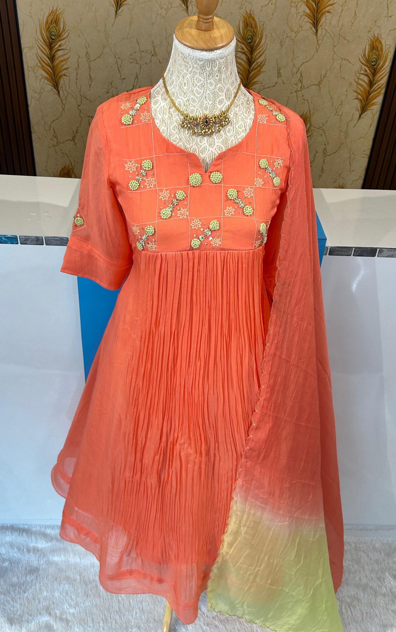 A premium dyable viscose organza outfit featuring delicate thread-embroidered floral highlights in an elegant check-box pattern. The soft, lightweight texture and graceful drape make it a perfect choice for premium party wear. Designed for timeless charm and effortless sophistication, this ensemble blends luxury with modern elegance — ideal for festive and special occasions.