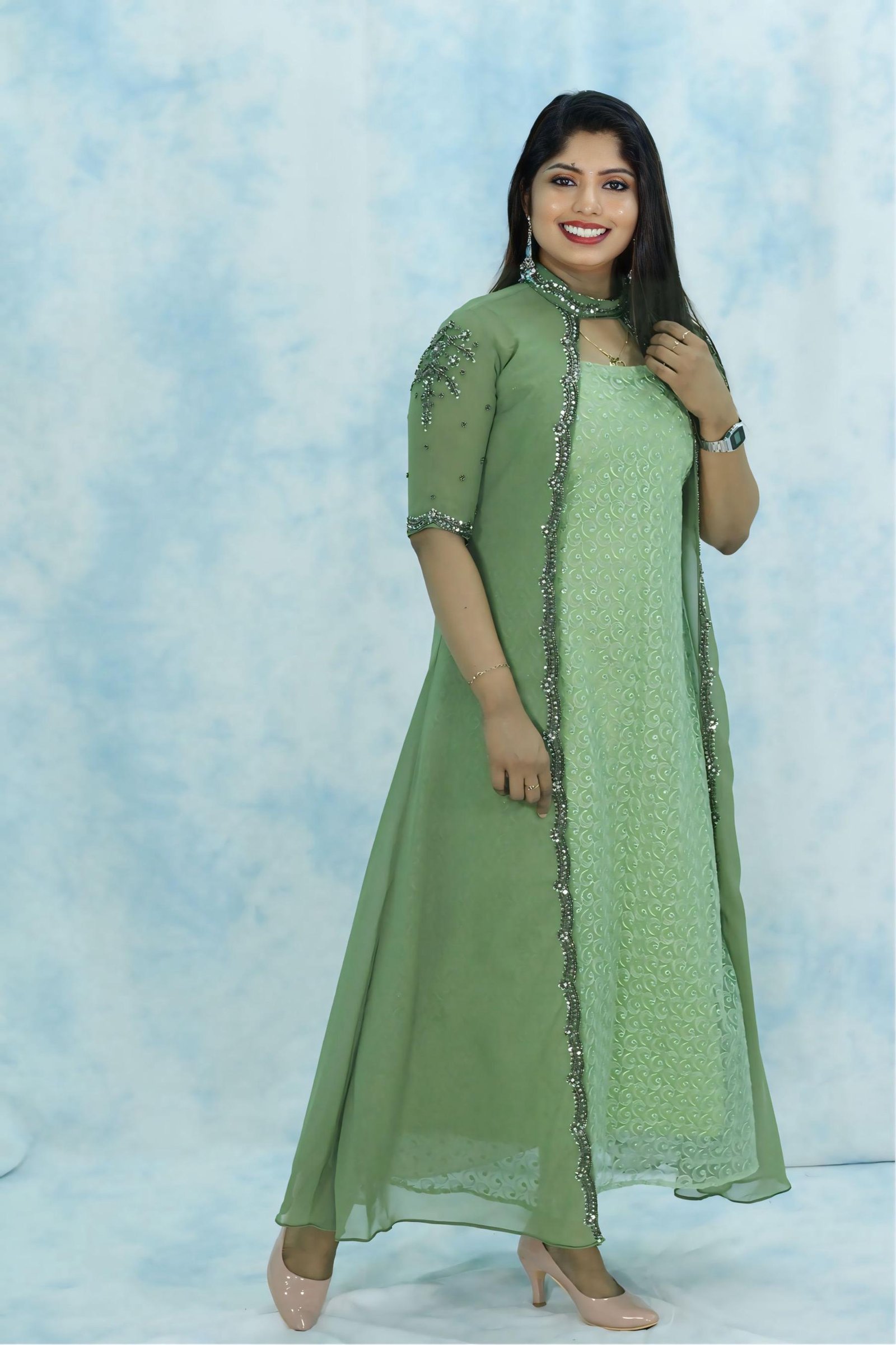 Make a regal statement with this stunning embroidered sleeveless inner gown, paired with a beautifully handworked jacket featuring a classic collar. The inner gown showcases intricate embroidery that adds depth and elegance, while the jacket’s detailed handwork enhances its luxurious appeal.