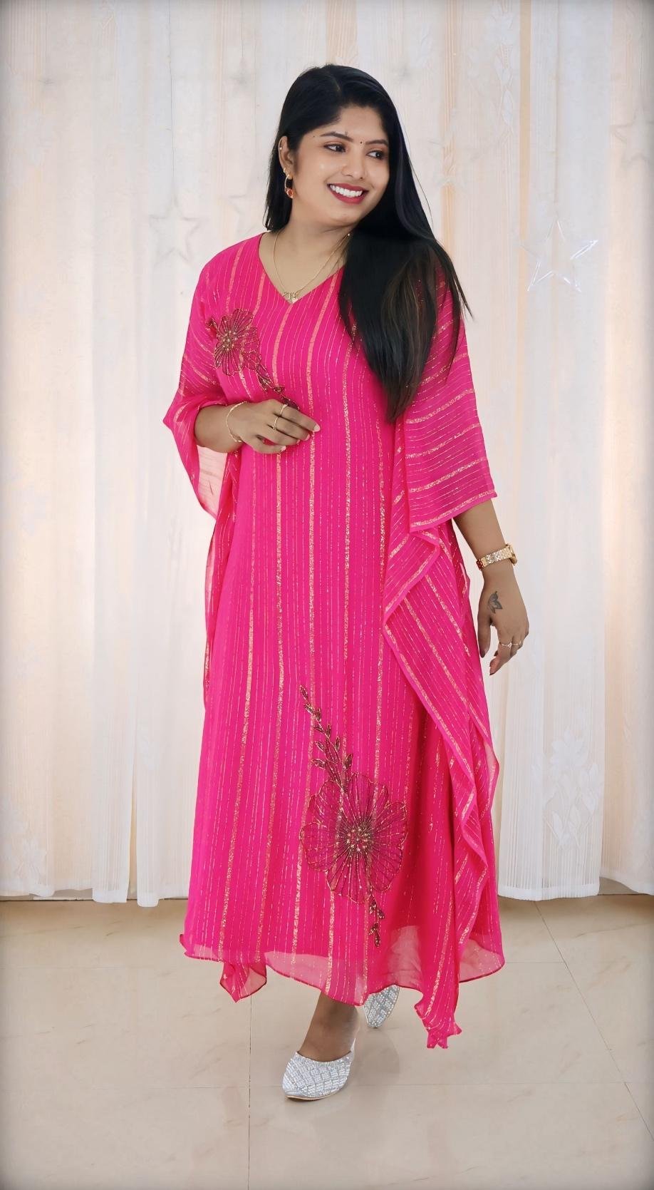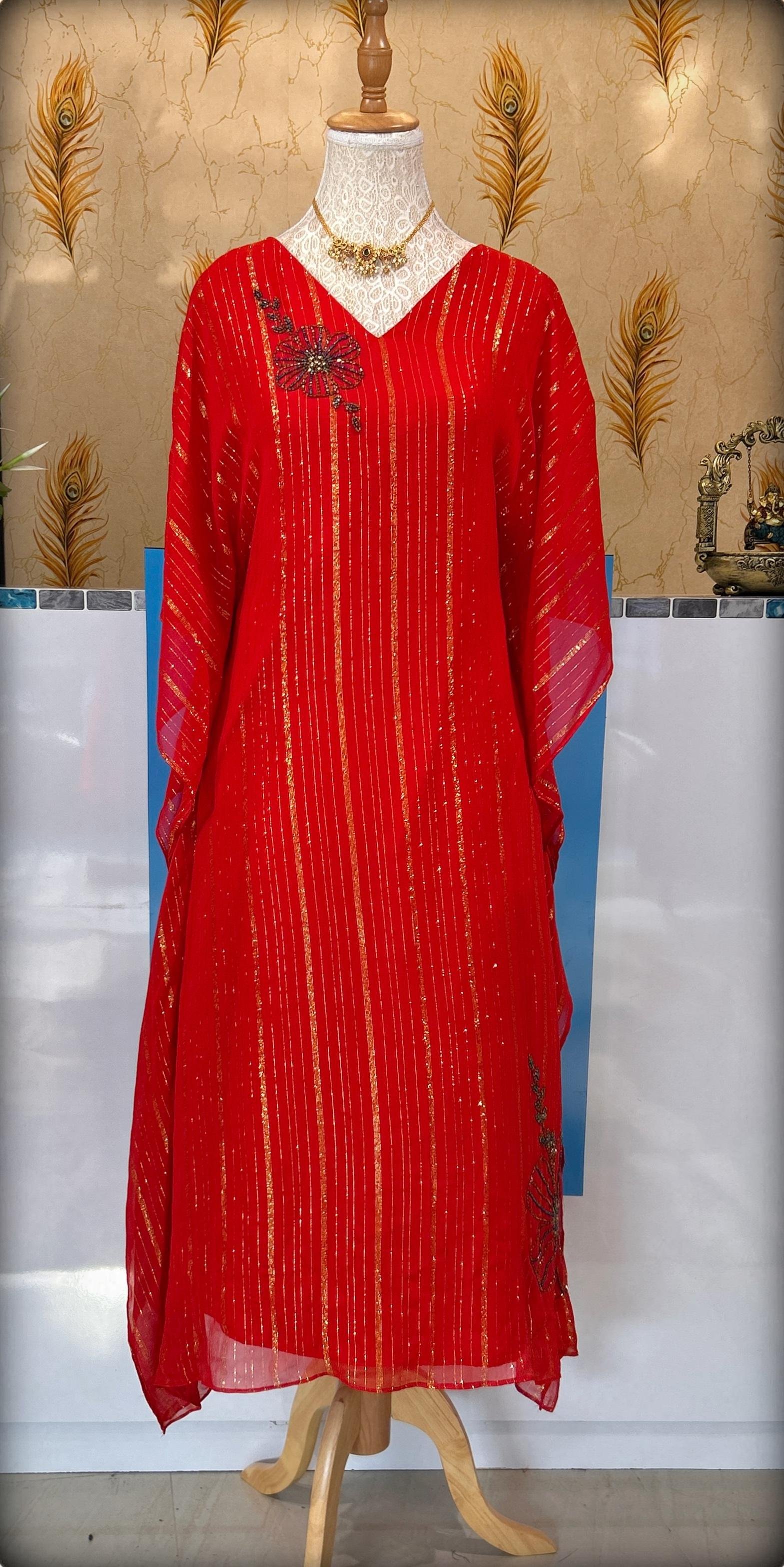 Stylish dyed georgette kaftan featuring subtle lurex lines that add a hint of shimmer and sophistication. The design is enhanced with delicate hand embroidery on the neckline and bottom portion, creating a perfect balance of elegance and comfort. Ideal for festive wear, resort looks, or evening gatherings — this kaftan offers effortless grace with a touch of luxury.