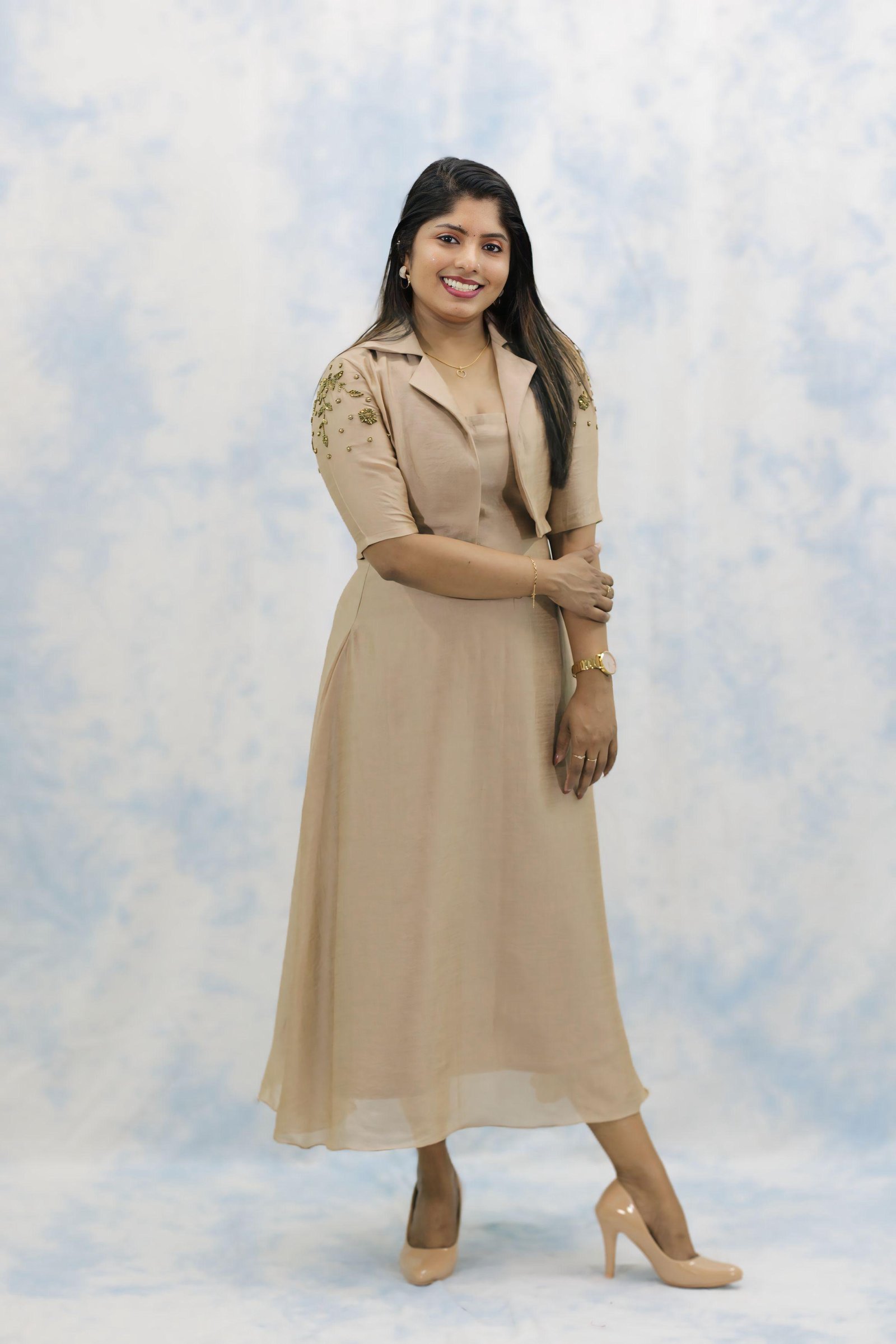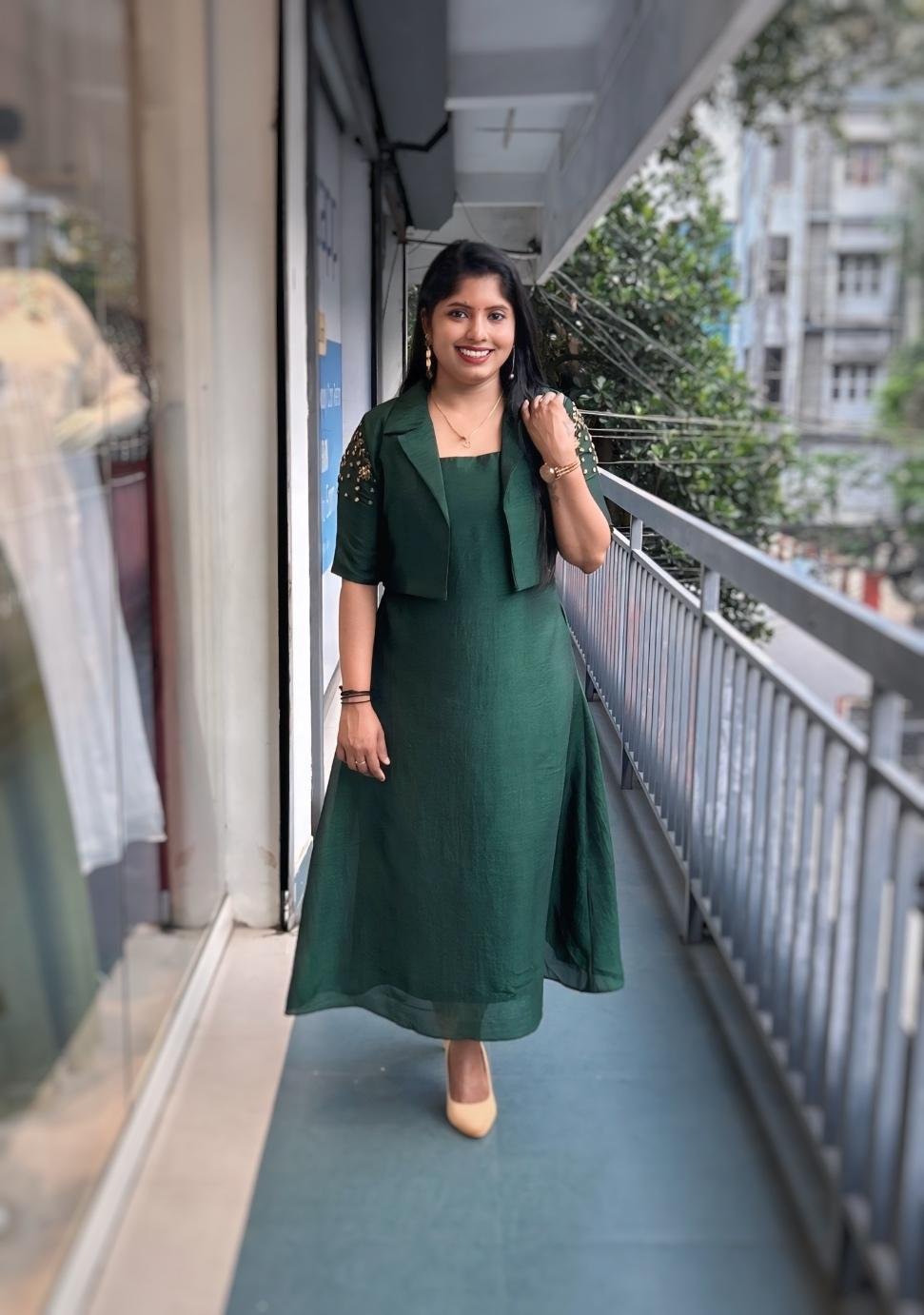 Stylish Vichitra silk inner paired with a matching coat-collar jacket crafted from the same rich fabric. The handwork detailing on the sleeves adds a refined and elegant touch, making it a perfect choice for festive and party wear occasions.