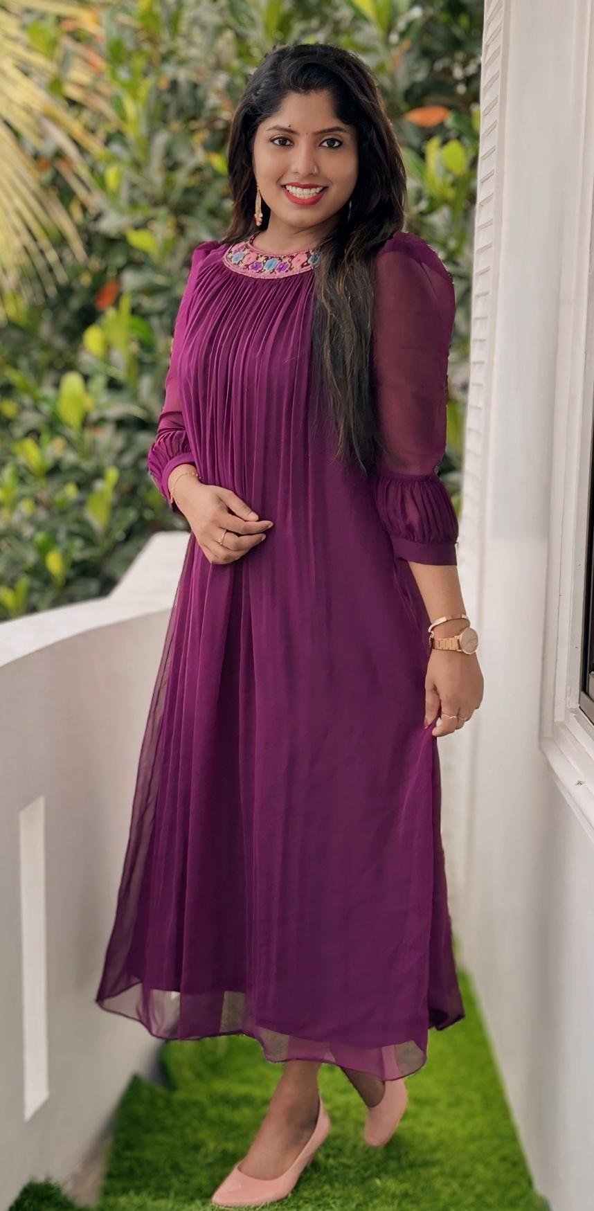 Charming georgette kurti featuring a closed neckline adorned with delicate thread work. Designed with gathers flowing from the neck and stylish puff sleeves, this outfit offers a graceful and feminine silhouette — perfect for festive and casual occasions.
