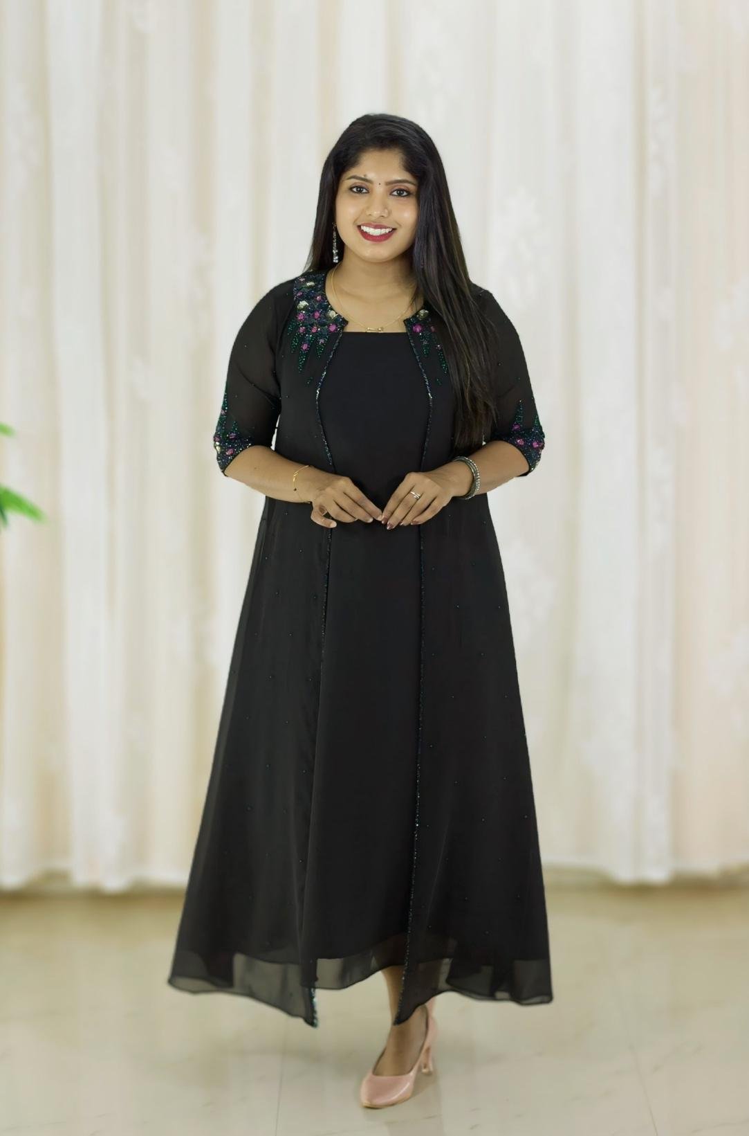 Elegant sleeveless georgette top paired with a beautifully handworked jacket, crafted to perfection for a party wear look. The intricate embellishments on the jacket add a luxurious touch, while the flowy georgette fabric ensures effortless style and comfort. Perfect for festive occasions, parties, and special evenings — a blend of modern grace and traditional charm.
