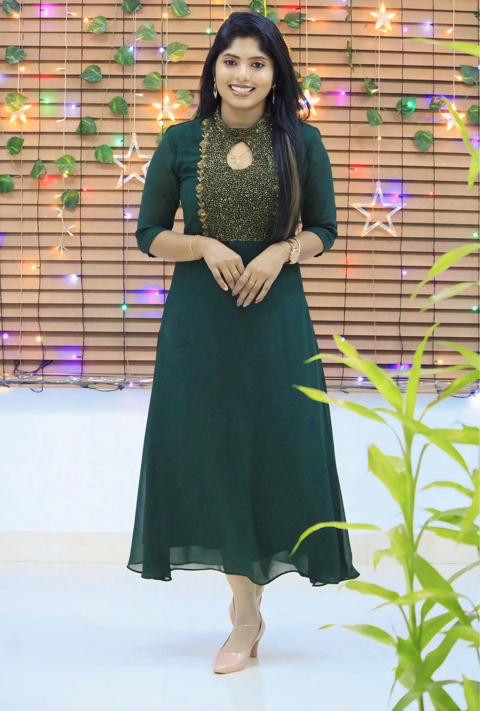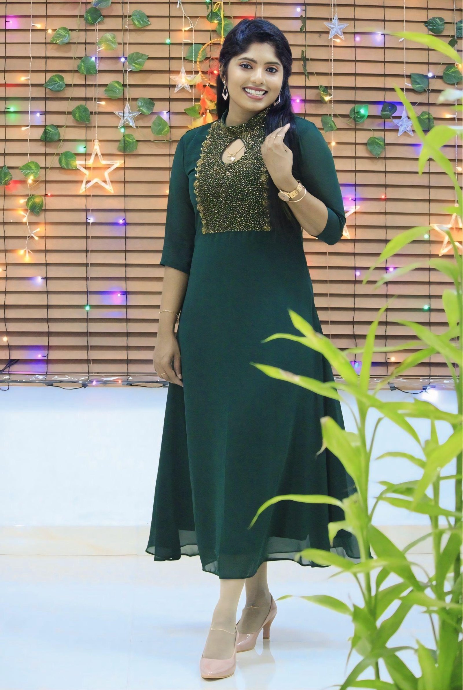 An elegant georgette kurti designed with intricate heavy handwork that exudes festive charm. Featuring a collar neckline with a stylish keyhole detail, this piece beautifully combines traditional craftsmanship with a touch of modern design. The thick, detailed handwork enhances its rich appeal — perfect for festive occasions, parties, and celebrations.