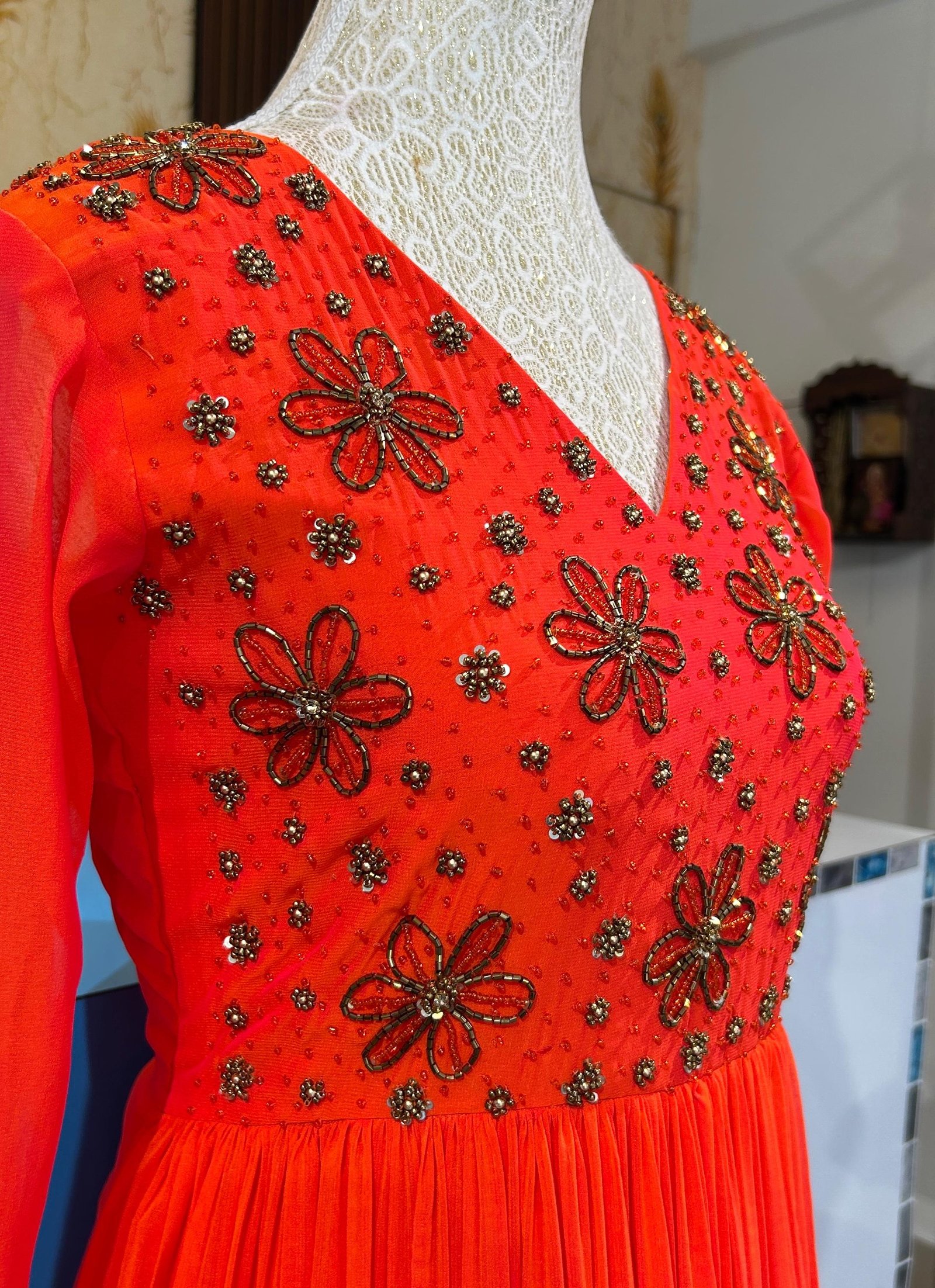 Exquisite faux georgette gown featuring full sleeves and intricate heavy handwork all over, adding a regal and luxurious appeal. The gown is beautifully designed with elegant frills on the yoke, enhancing its feminine grace. Perfect for festive occasions, weddings, or evening events — this gown combines craftsmanship, comfort, and sophistication effortlessly.