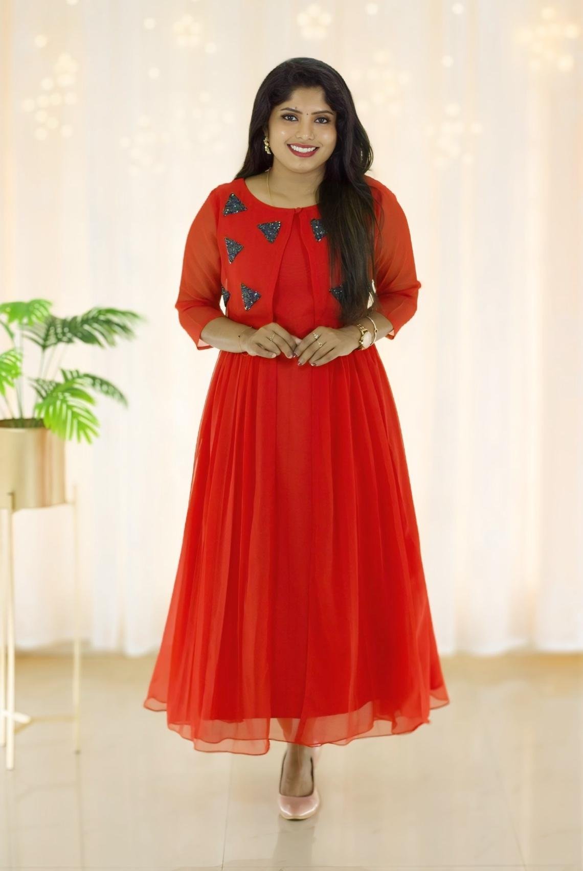 Stylish georgette kurti paired with an attached jacket featuring elegant gathers and intricate handwork. The layered design adds a touch of sophistication, making it perfect for festive and party wear occasions.