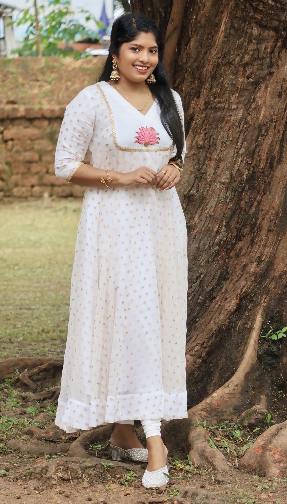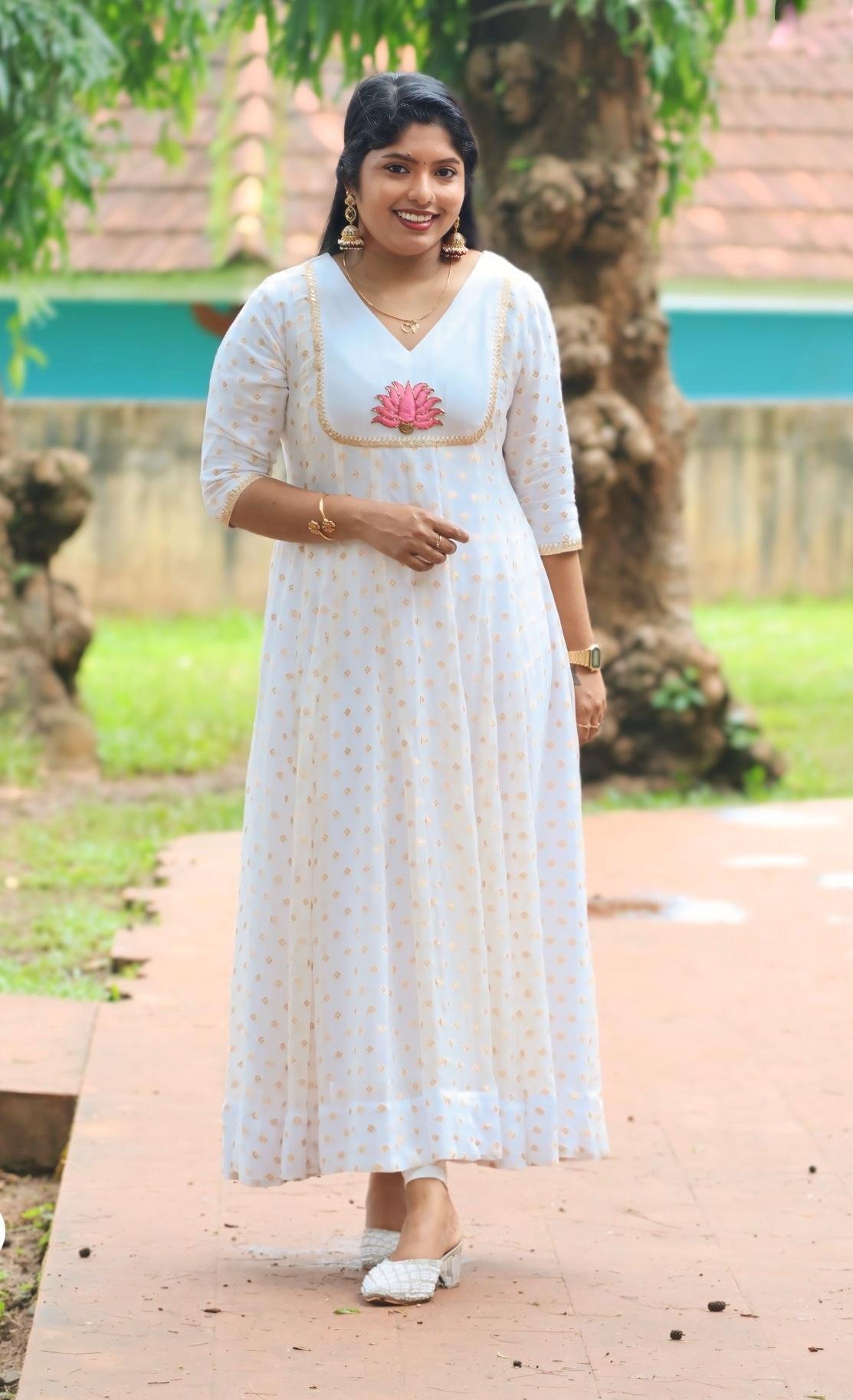 Graceful viscose georgette kurti adorned with elegant zari butta print all over, crafted in a flattering panel-cut design for a refined silhouette. The yoke features intricate lotus hand thread embroidery, adding a touch of artisanal beauty. Perfect for festive gatherings or elegant daywear, this kurti blends traditional craftsmanship with contemporary style.
