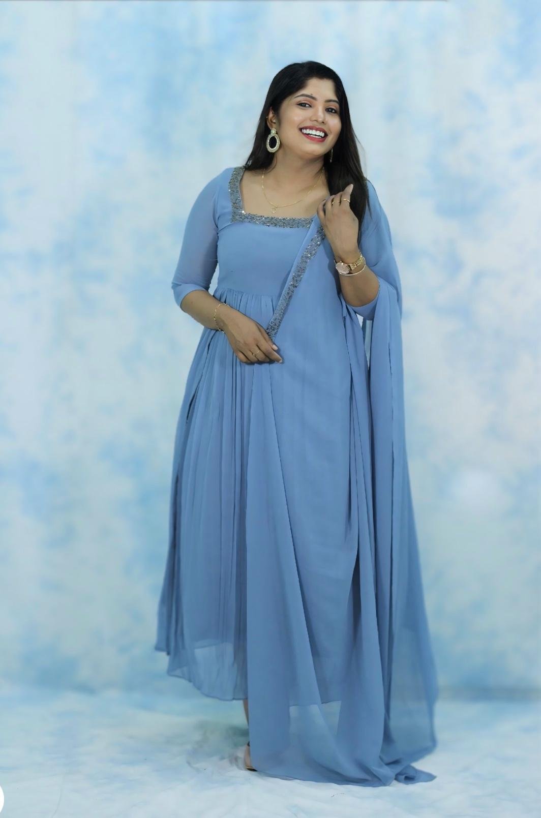 Elegant georgette slit top featuring a stylish square neckline and delicate frill detailing for a feminine touch. The design includes an overlapping front slit, adding a trendy layered look.