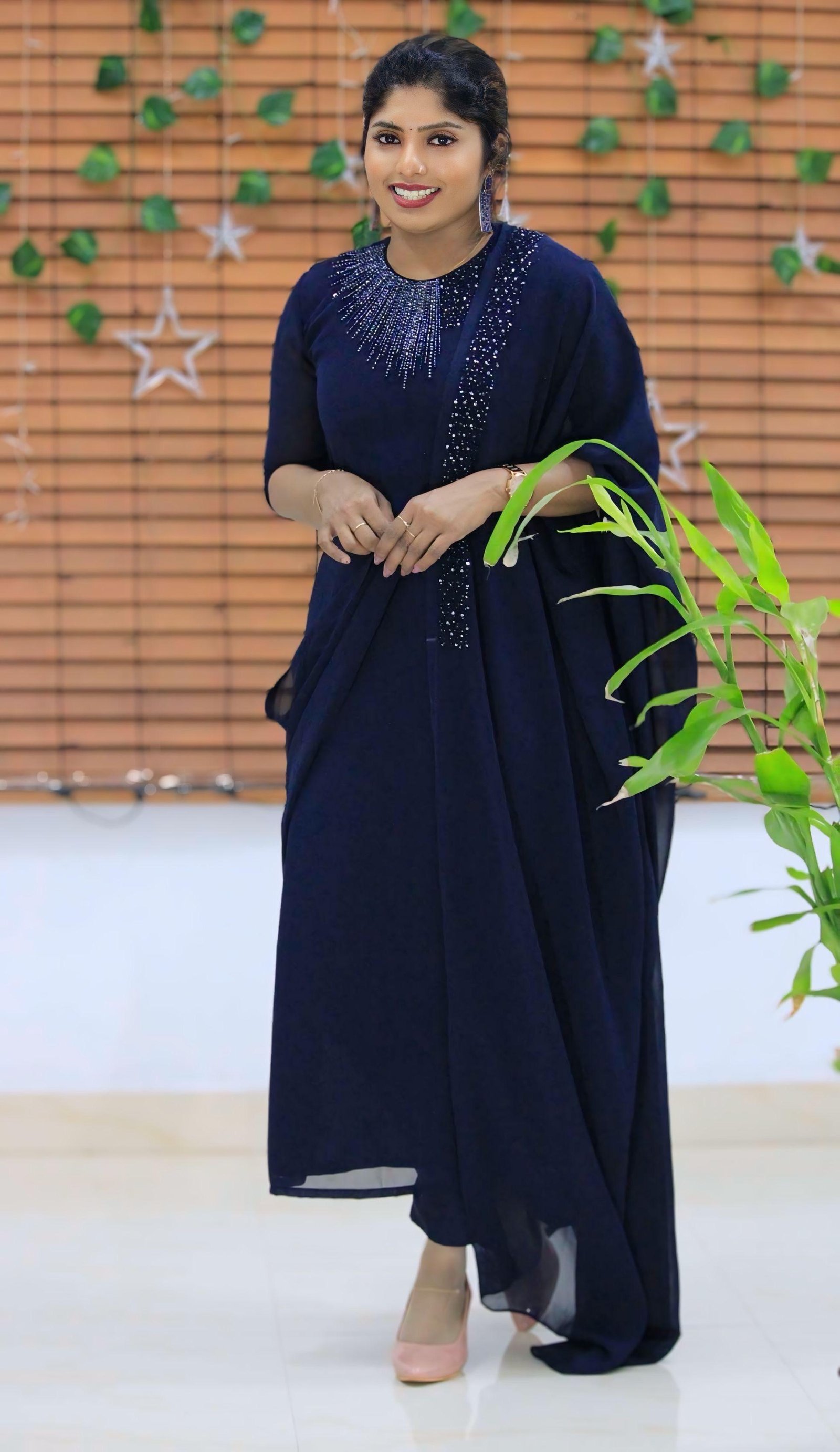 Graceful slitted top crafted from premium fabric, featuring heavy handwork adorned with sequins and beads. The closed neckline adds an elegant touch, making it perfect for festive and party occasions.